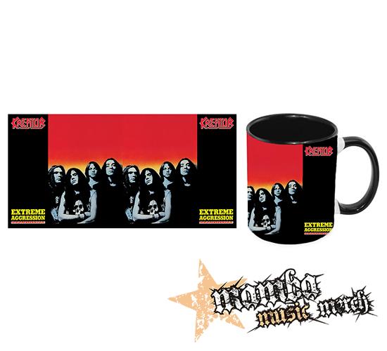 Keramický hrnček s motívom KREATOR. Hrnček má čierne ucho a čierne vnútro.
